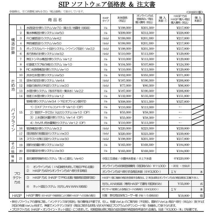 ソフトウェア(商品)の価格表(オンライン認証版)をイメージ画像で表示しております。 ソフトウェア価格表&注文書(FAX用紙)をご利用になりたい場合は、右ボタンの「価格表&注文書」 ボタンをクリックすると「PDF版」で入手可能です。 ※価格は、税抜き及び税込み(消費税10%)で表示しています。(2026年1月6日より適用)
